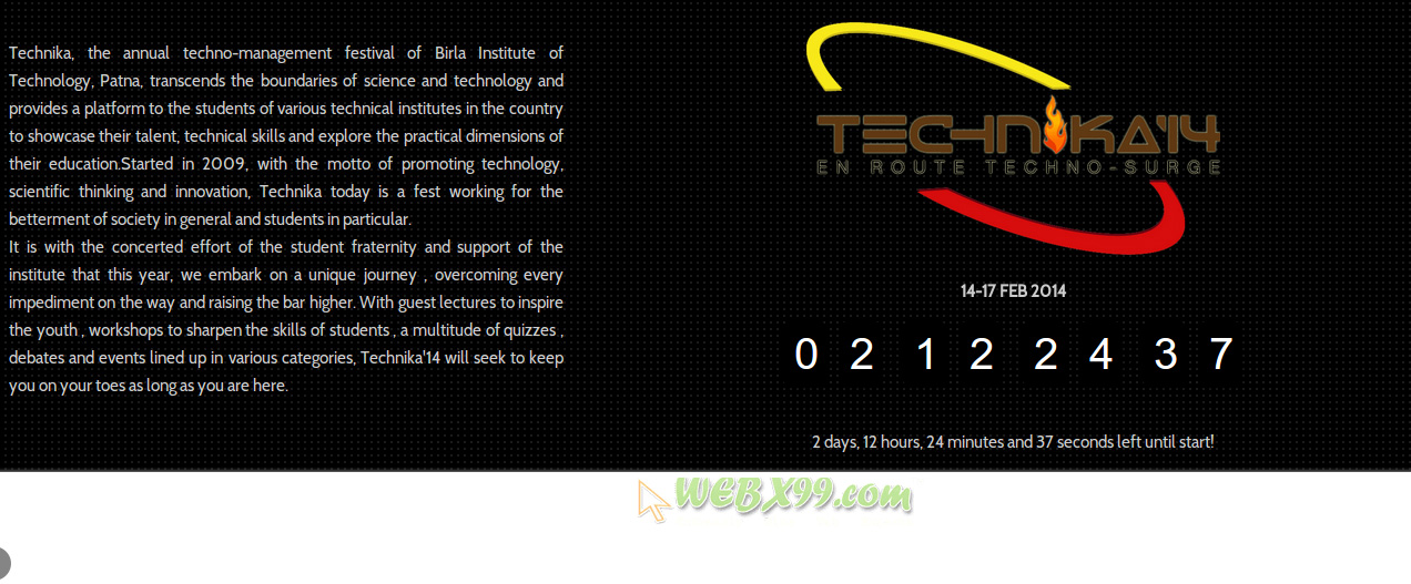 Webx99 team is very proud to power TECHNIKA 2014 (14th Feb to 17th Feb )which is annual techno-management festival of Birla Institute of Technology, Patna. Apart from sponsoring this 4 day event we are also powering web hosting for official website of Technika. Few days ago we had also sponsored annual festival of Indian Institute of Technology Patna.